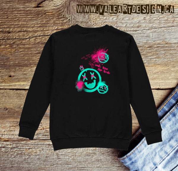 Graphic design with three "emoji" style faces. The faces are bluish green and have "x" eyes. The biggest face has a blue green crown. There are pink splashes around the faces, and the phrase "Hail Rule The King"